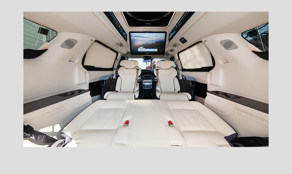 - 원형 은하수등, 취침등으로 편안함을 주고 샤무드 천장으로 라인이 마감되어 있다. 금형으로 제작한 TV와 일체형 같은 LED베젤, 다양한 ott등 다양한 기능이 탑재된 27인치 삼성 스마트 TV가 설치되어 있다. 그리고 1열 내비게이션에서 후석 모니터를 통합 제어할 수 있는 120만 원 상당의 통합제어시스템이 장착되어 있다.