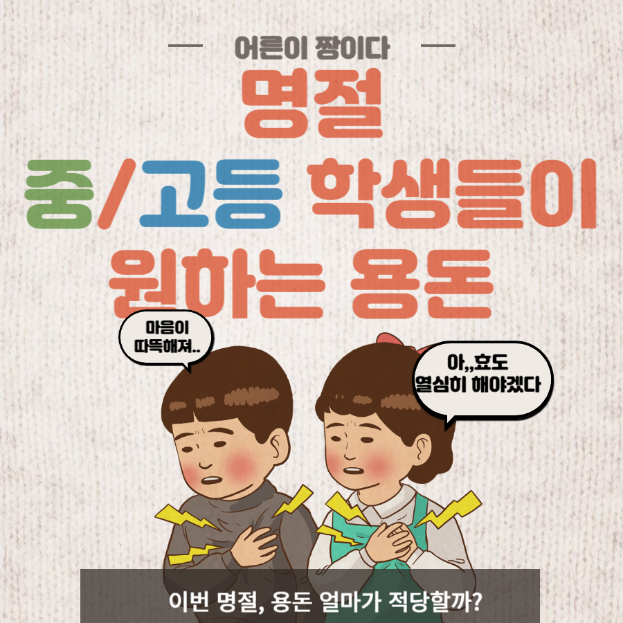 학생들 용돈도 오르고 물가도 올라서 왠만한 용돈으로는 하루 놀기(?)에도 빠듯하다고 하네요. 그래서 중학생은 7만원, 고등학생은 10만원정도 세뱃돈을 바란다고 합니다.